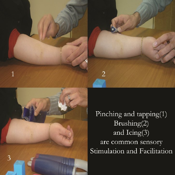 ⁃التحفيز الحسي للأطراف المتأثرة ، سواء تحفيز كهربائي او حار/بارد وغيره.