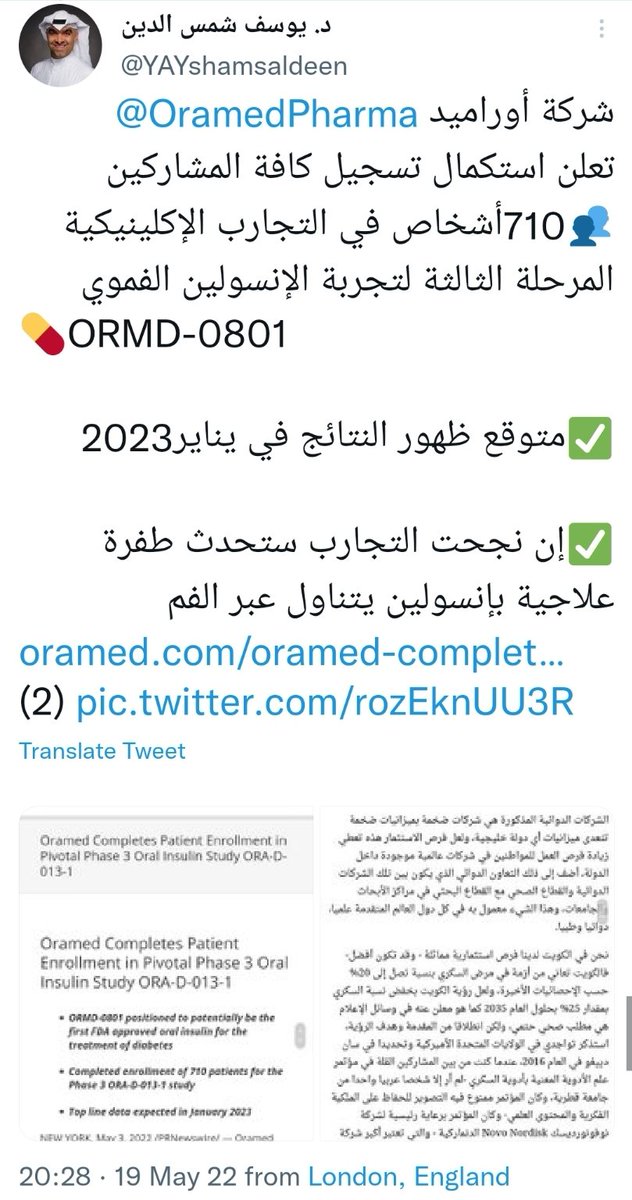 شركة أوراميد @OramedPharma تنشر نتائج التجارب الإكلينيكية المرحلة2️⃣للإنسولين الفموي التجريبي