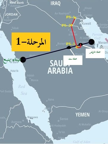 🔶الخط يبدأ من(الزبير بالبصرة حتى الخريّص بالأحساء)مع3محطات ضخ(PS)و4خزانات للنفط سعةالواحد(1مليون برميل)أنشِئَت بمحطةالضخ(PS-3)بالخريّص