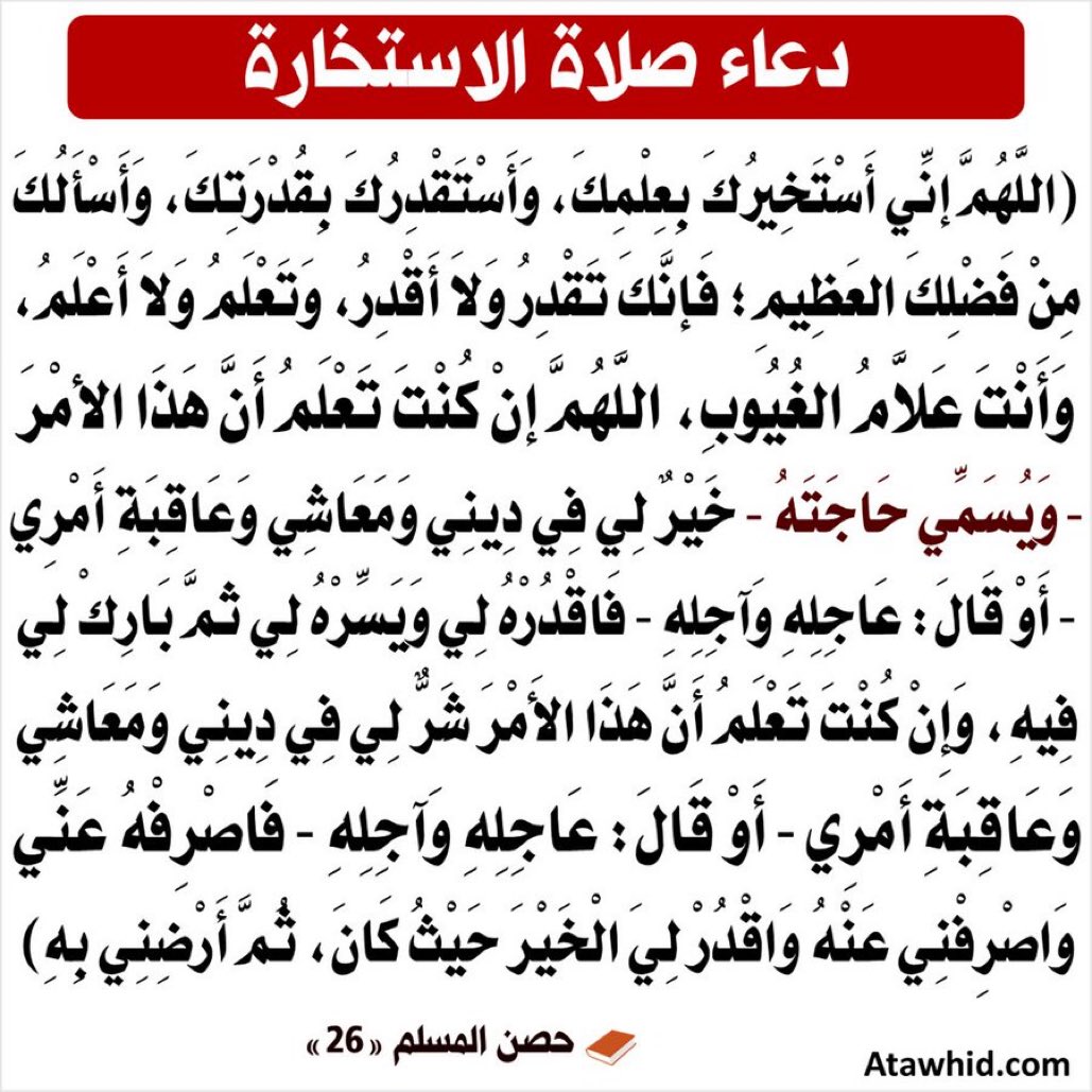 نحن البشر نظرنا قاصر على الحاضر، لذا لسنا مؤهلين لتفسير قراراتنا للمستقبل، لذلك جعل الله لنا من رحمته الاستخارة، وهي ان تطلب الخيرة فالشيء في دينك ومعاشك وعاقبة امرك، والرضا على ذلك، لذا اجعل الاستخارة عادة، ان فعلت ستشعر براحة عظيمة وكأنك سلمت امرك الى من بيده القدر.