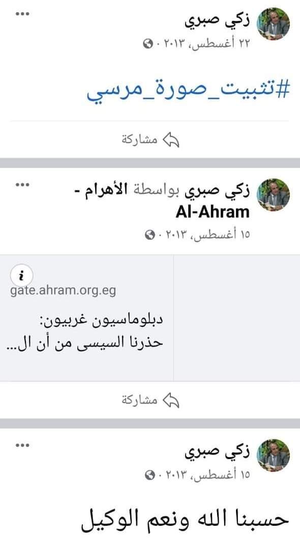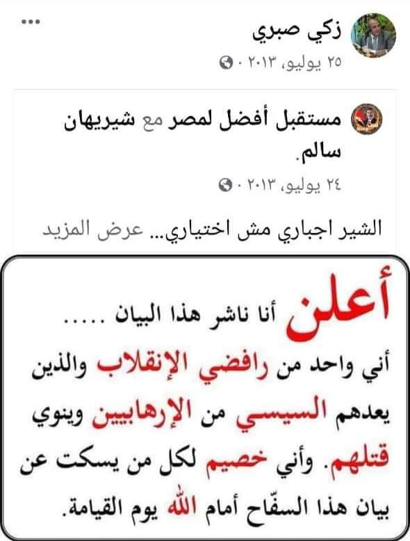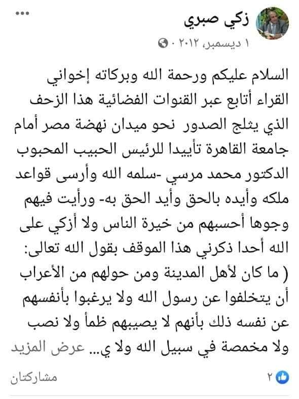 وأحمد الطيب، شيخ الأزهر، ومحمد المحرصاوي، رئيس جامعة الأزهر، وأبو زيد الأمير، نائب رئيس الجامعة للوجه البحري، على علم تام بأن زكي صبري، له عشرات - إن لم يكن المئات - الكتابات التي يدعم فيها جماعة الإخوان الإرهابية، وفي المقابل يعادي الدولة ويتطاول على #الرئيس_عبدالفتاح_السيسي