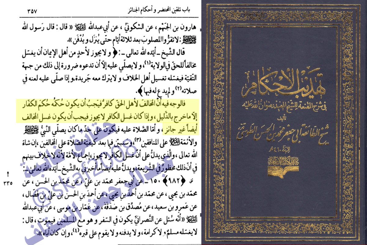 @AL3MM30 2⃣ الشيخ الطوسي، كفّر أهل السنة، يقول :(المخالف لأهل الحق كافر فيجب أن يكون حكمه حكم الكفار)