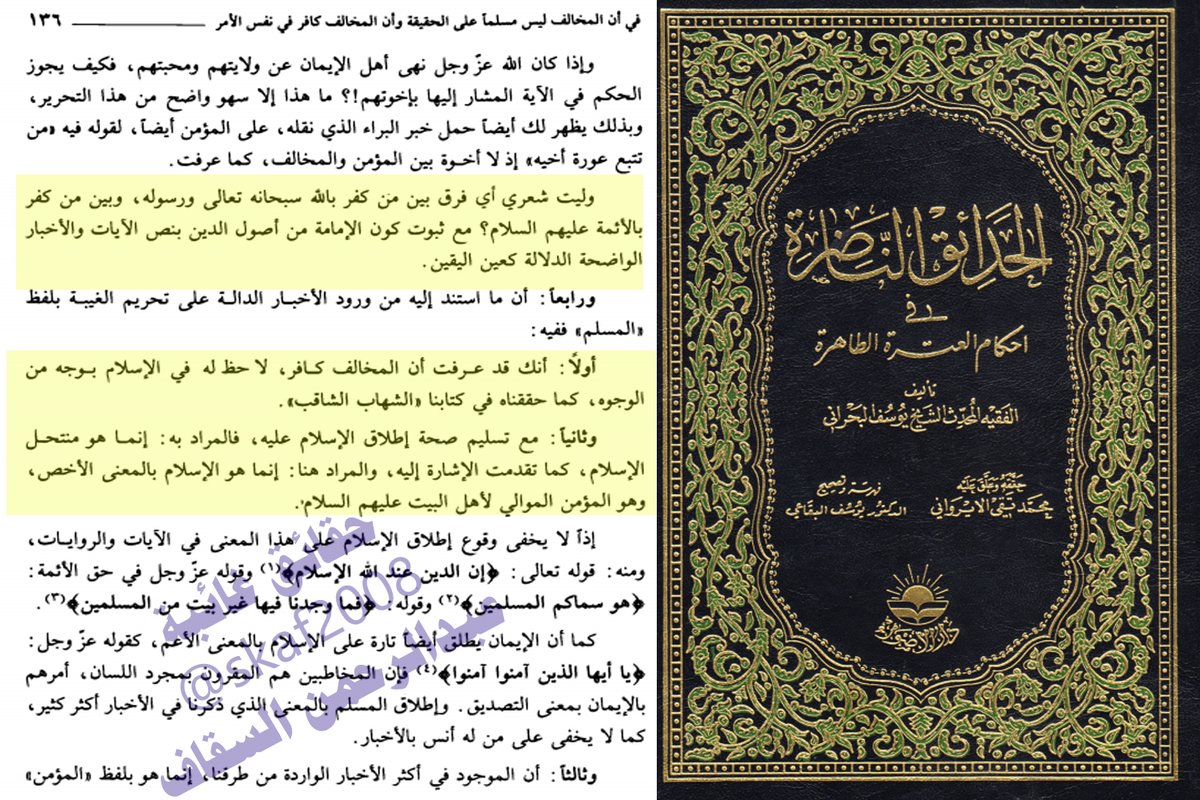@AL3MM30 5⃣ يوسف البحراني، حيث يقول:(وليت شعري أي فرق بين من كفر بالله سبحانه وتعالى ورسوله، وبين من كفر بالأئمة عليهم السلام؟).