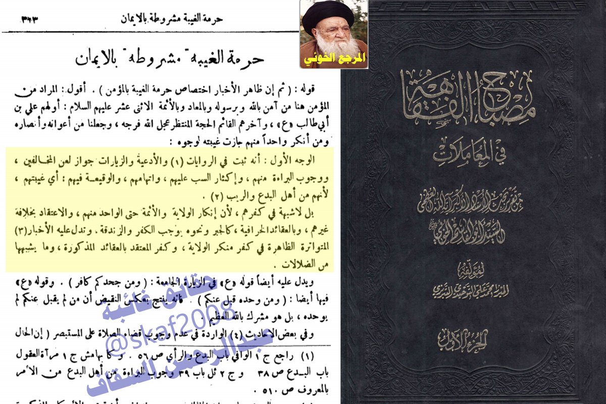 @AL3MM30 8⃣المرجع المعاصر أبوالقاسم الخوئي، يقول:(أنه ثبت في الروايات والأدعية والزيارات جواز لعن المخالفين، ووجوب البراءة منهم، واكثار السب عليهم واتهامهم، والوقيعة فيهم أي غيبتهم، لأنهم من أهل البدع والريب.بل لا شبهة في كفرهم).