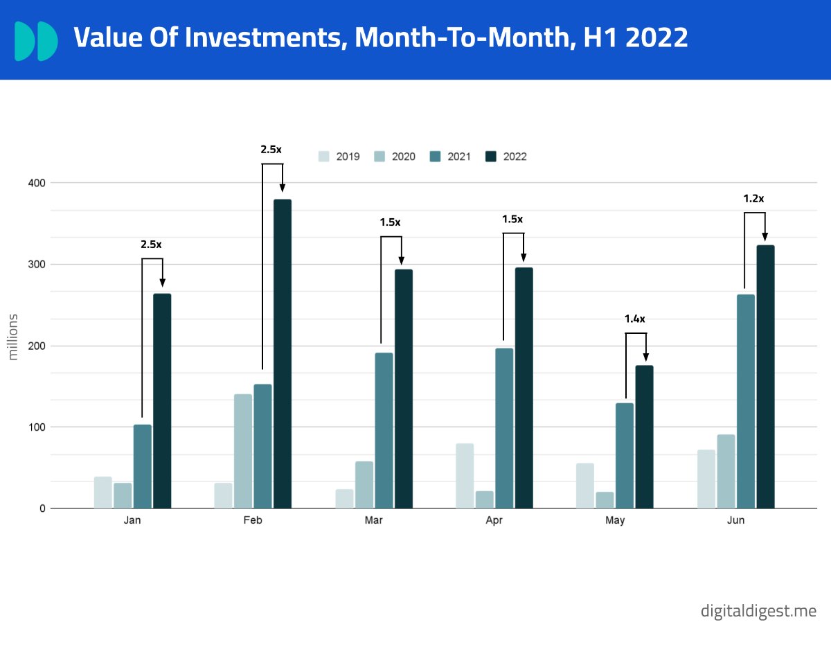 ولذلك نرى تزايد ضخم بين السنتين ٢٠٢٠ و ٢٠٢١ في رأس المال الجريء بنسبة ١٣٨٪. بالإضافة إلى ضخ شركات المال الجريء أموال تصل إلى ١.٧٣ مليار دولار أمريكي (≈ ٦ مليار درهم إماراتي) فقط في الأشهر الستة الأولى من ٢٠٢٢.