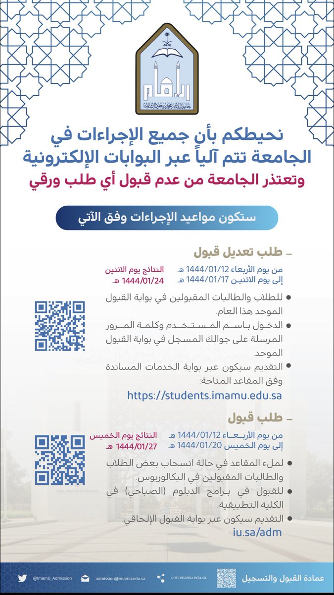 يبدأ القبول الإلحاقي للي ما نقبل في التقديم الأساسي يوم ١٤٤٤/١/١٢ إلى يوم ١٤٤٤/١/٢٠ لمقاعد البكالوريوس الشاغرة و الدبلوم