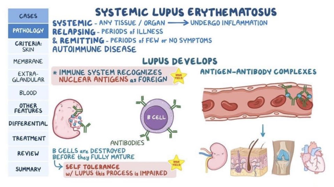 ايضا مراقبة انزيمات الكبد لأنها تتأثر خلايا الكبد بسبب مناعة الذائبه ويكون هناك التهاب مناعي يرفع انزيمات الكبد واذا لم يعالج السبب الذي