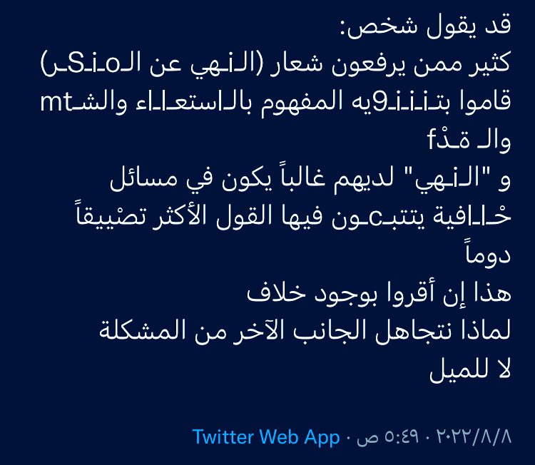 ولكن إذا وصلنا لجزئية الأمر بالمعروف والنهي عن المنكر أعطى السيادة لهواه وضرب بالشرع عرض الحائط وسرد لك سلسلة من ألفاظ العزة بالإثم: مستشرف، دع الوصاية عنك، لادخل لك!