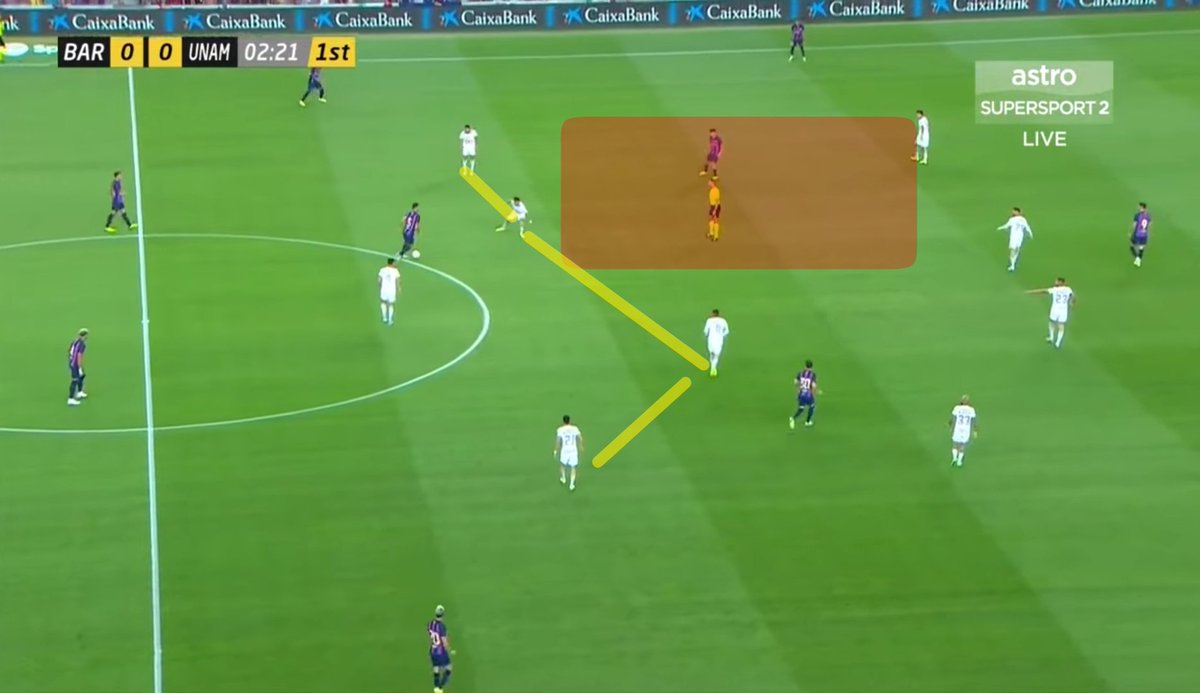 - بتواجد كل من بيدري و جافي في أنصاف المساحات وراء خط وسط بوماس يجعلهم مضطرين للإنكماش و محاولة غلق تلك المساحات. و هذا ما يحرر الجناحين و يجعلهم في موقف واحد ضد واحد.