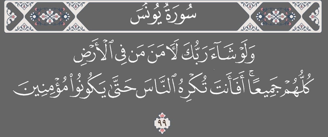 ومحاولة جعل الناس كلهم مؤمنين محاولة تخالف سنة الله المرتبطة بحق الإنسان في اختيار موقفه من الإيمان...