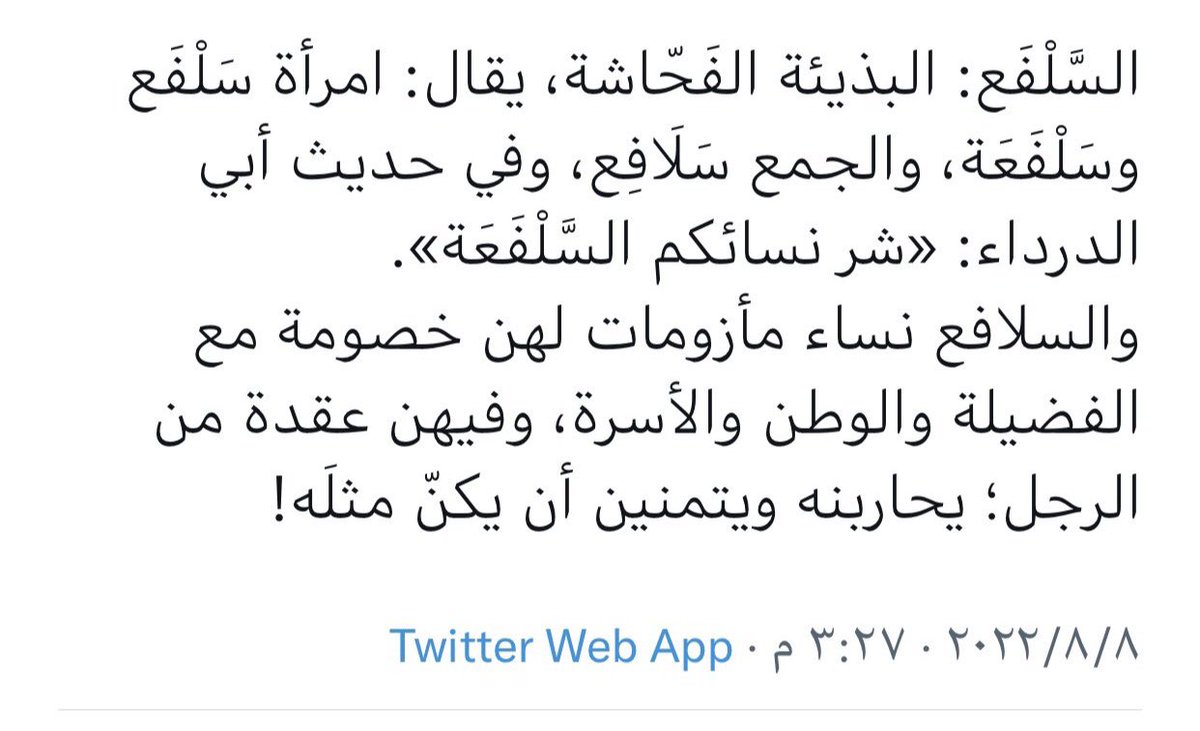 ٨-ثم في خاتمة التغريدة ينكشف تحيز القائل، وعنصريته الجنسية، وتعاليه الذكوري الطبقي حين يقول: "وفيهنّ عقدة من الرجل، يحاربنه، ويتمنين أنْ يكنّ مثله".
