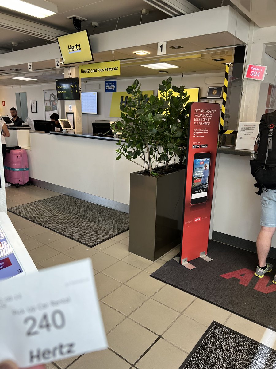 ابلغ مكتب السيارات عن موعد وصولك تفاديا لتاخر رحلتك كما حصل معي لكي لا يتم الغاء حجزك وصلت الى مطار ستوكهولم ارلاندا المدينه الهادئه وتوجهت بعد استلام الشنط الى خارج المطار واخذت الباص الترددي الى مواقف ايجار السيارات حجزي لدى هرتز الموظفين بشوشين ومتعاونين@Sverige2020