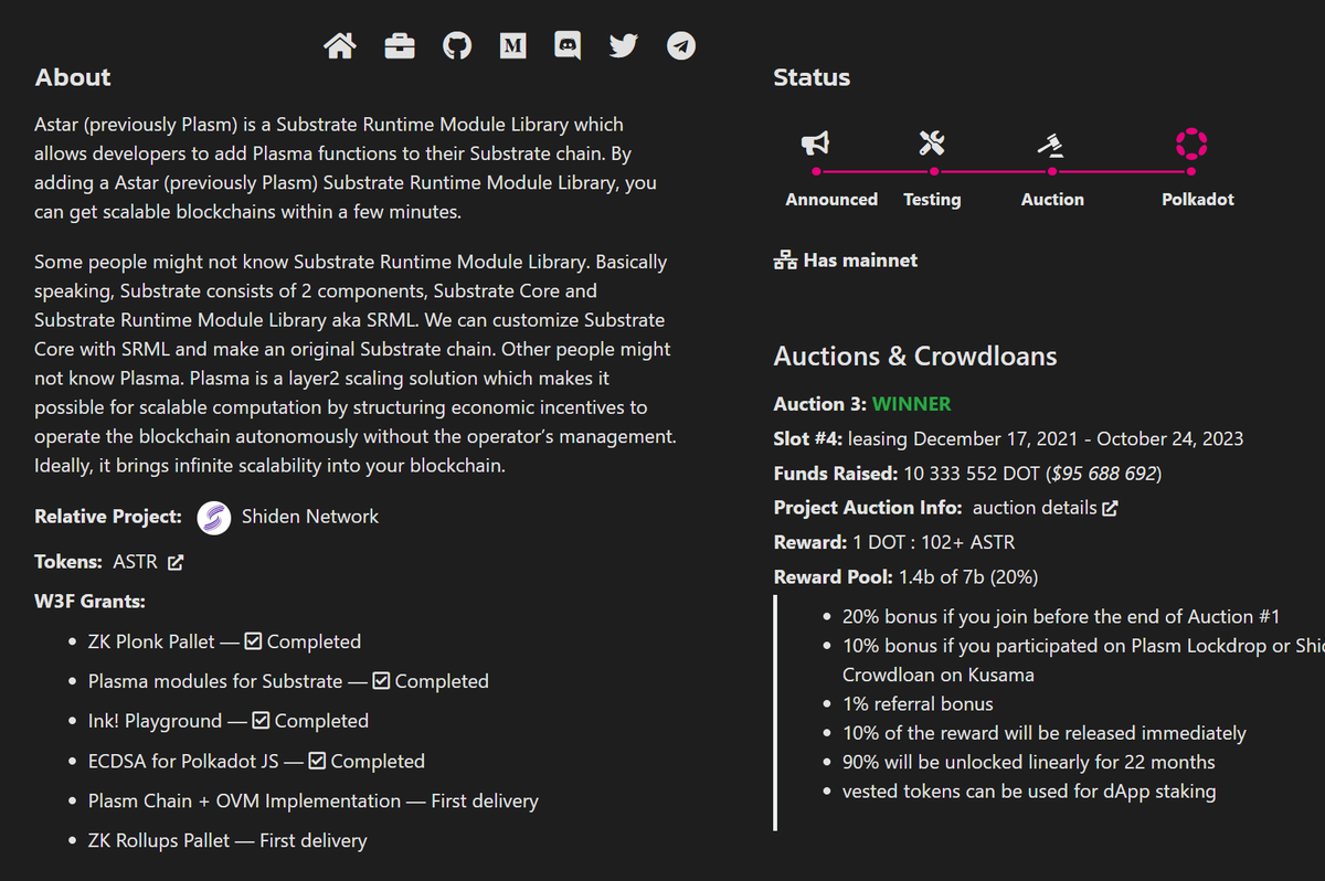 في 17 ديسمبر 2021 نجح مشروع Astar في تأمين مكان له داخل Polkadot Parachain في المزاد رقم 3. حيث حصل على تمويل بقيمة 10,333,552 عملة #DOT. طبعًا هذه العملات يتم الإغلاق عليها بعقد ذكي لحين انتهاء مدة تأجير لمكانه في الـParachain والذي ينتهي في 23 أكتوبر 2024.