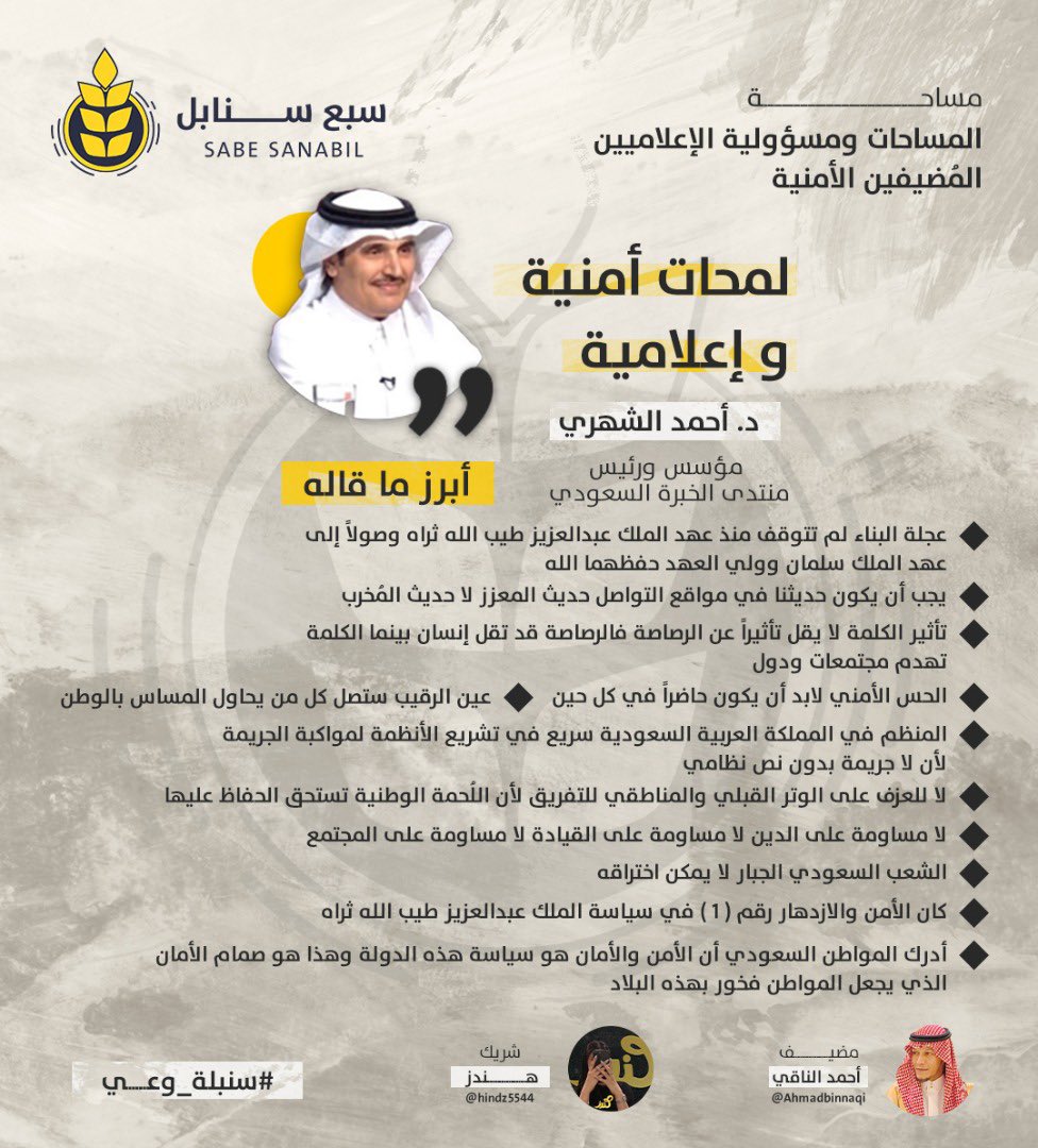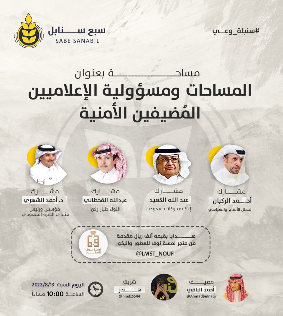 يتجدد بكم اللقاء في تمام الساعة 10:00 مساءً بعنوان ( المساحات ومسؤولية الإعلاميين والمُضيفين الأمنية )