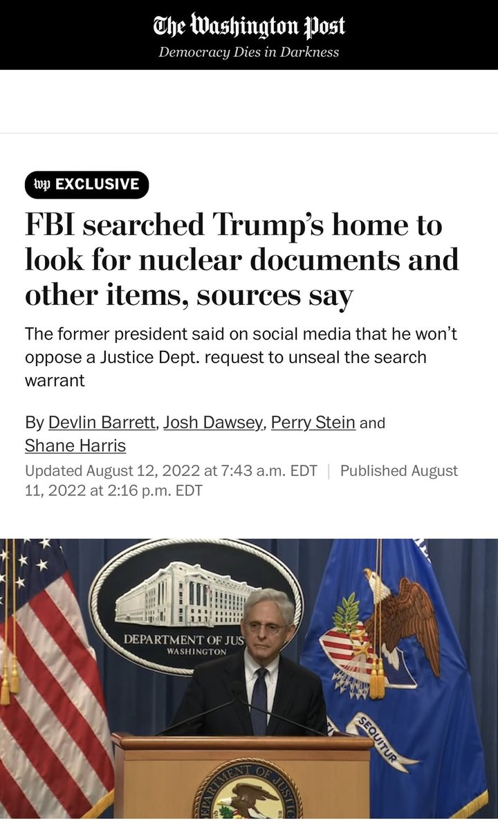 • رجعت القصة من جديد يوم أمس عندما نشرت @nytimes تقريرا يقول إن المداهمة كانت لـ استرجاع وثائق نووية أخذها ترامب عندما غادر البيت الأبيض !