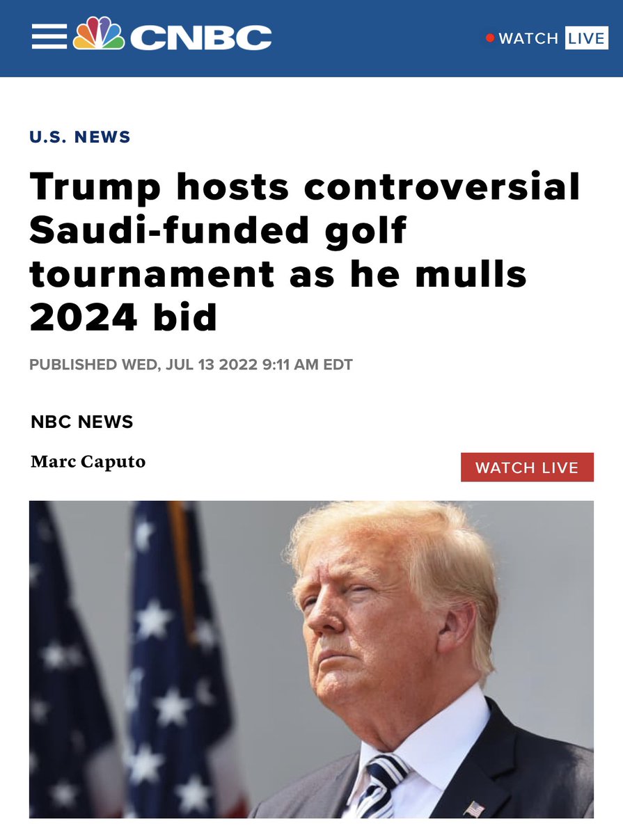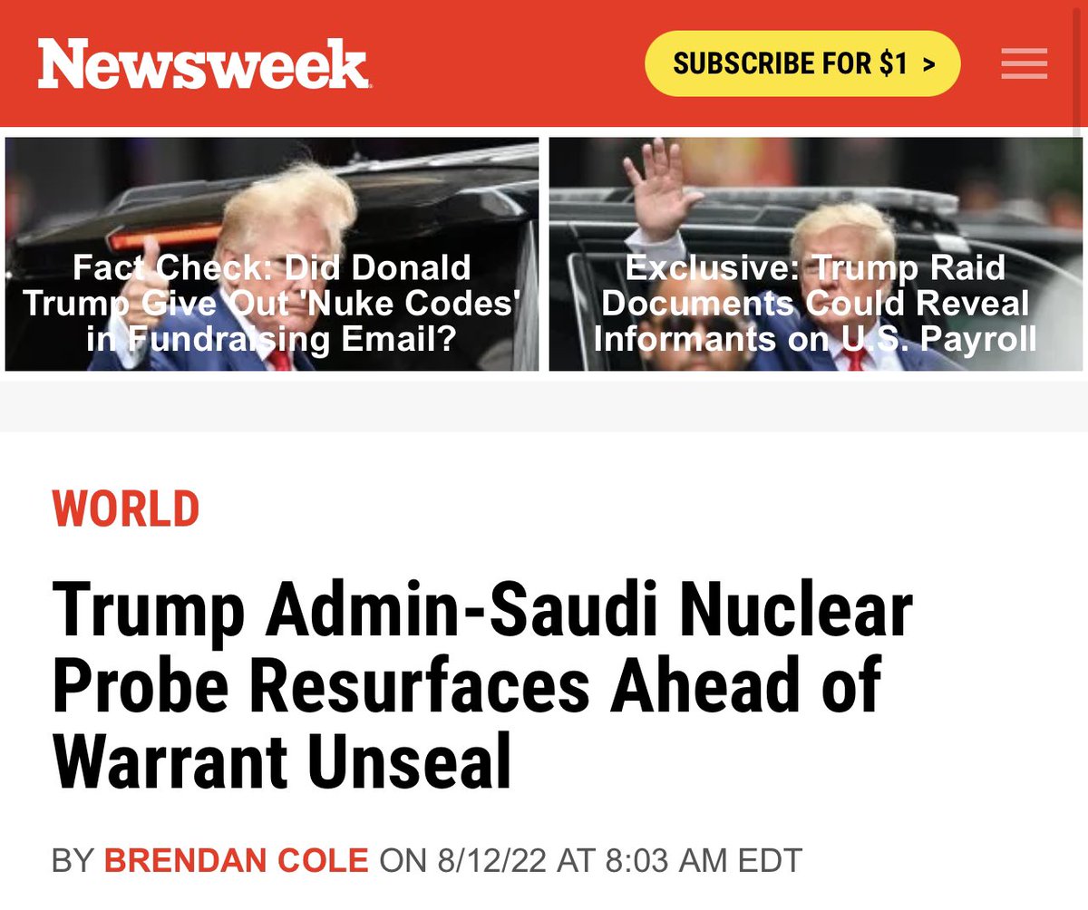 • بعد هالخبر ، نشرت @Newsweek تقريرا أخذته من كلام الصحفي @JuddLegum حيث ذكرت فيه أنه من المحتمل أن ترامب أخذ هذه الوثائق لـ بيع و نقل التكنولوجيا النووية إلى السعودية ، التقرير ذكر إن رعاية السعودية لبطولة جولف في ملاعب ترامب قد تكون جزء من الصفقة أيضا 😂