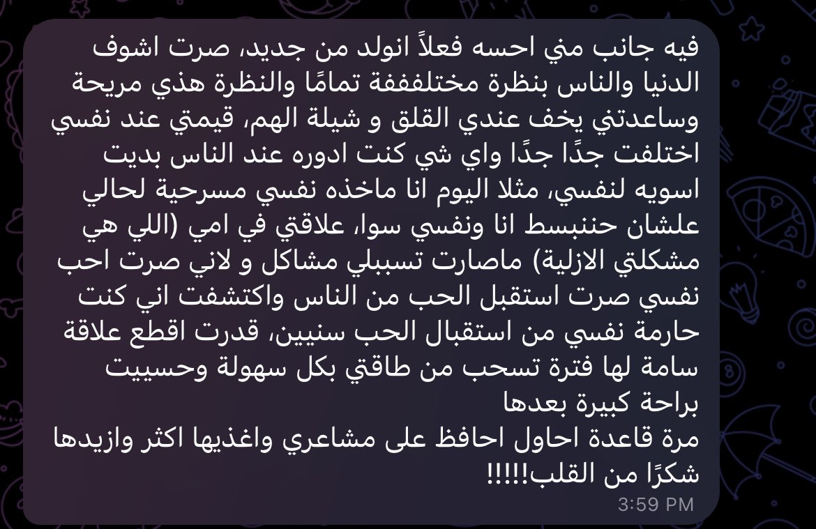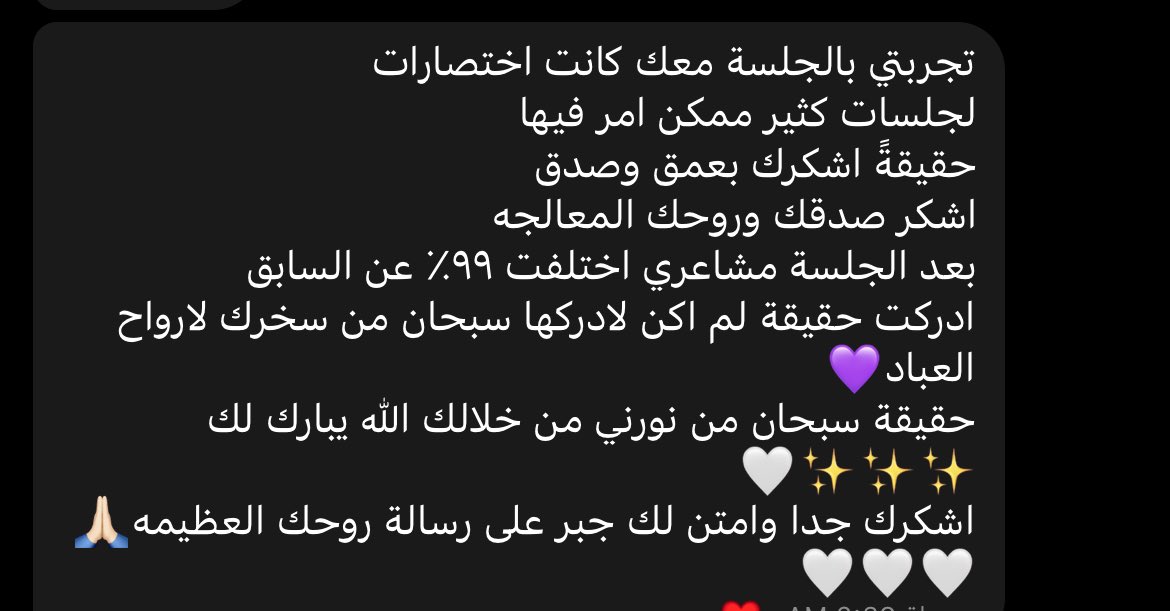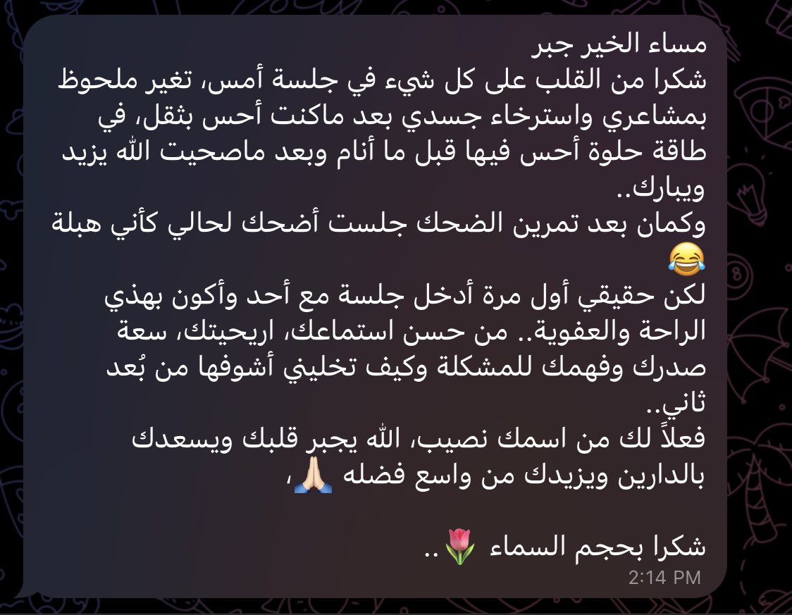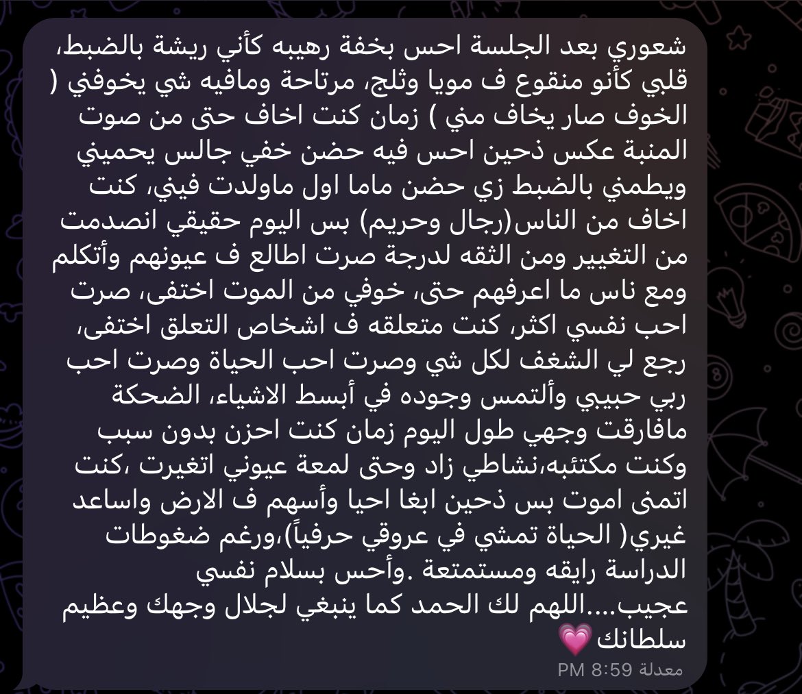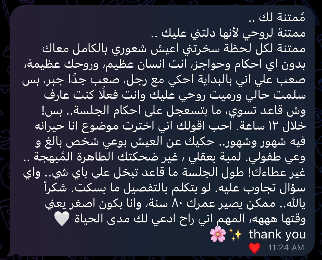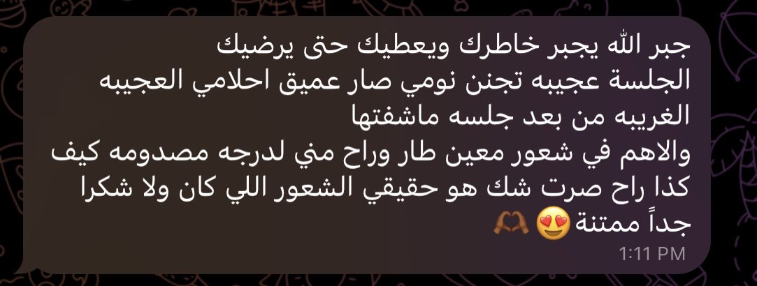 شكراً لله اولاً فوق كل شيء ، وحباً لإستقبالكم للجلسات واسهامكم لي ايضاً ❤️