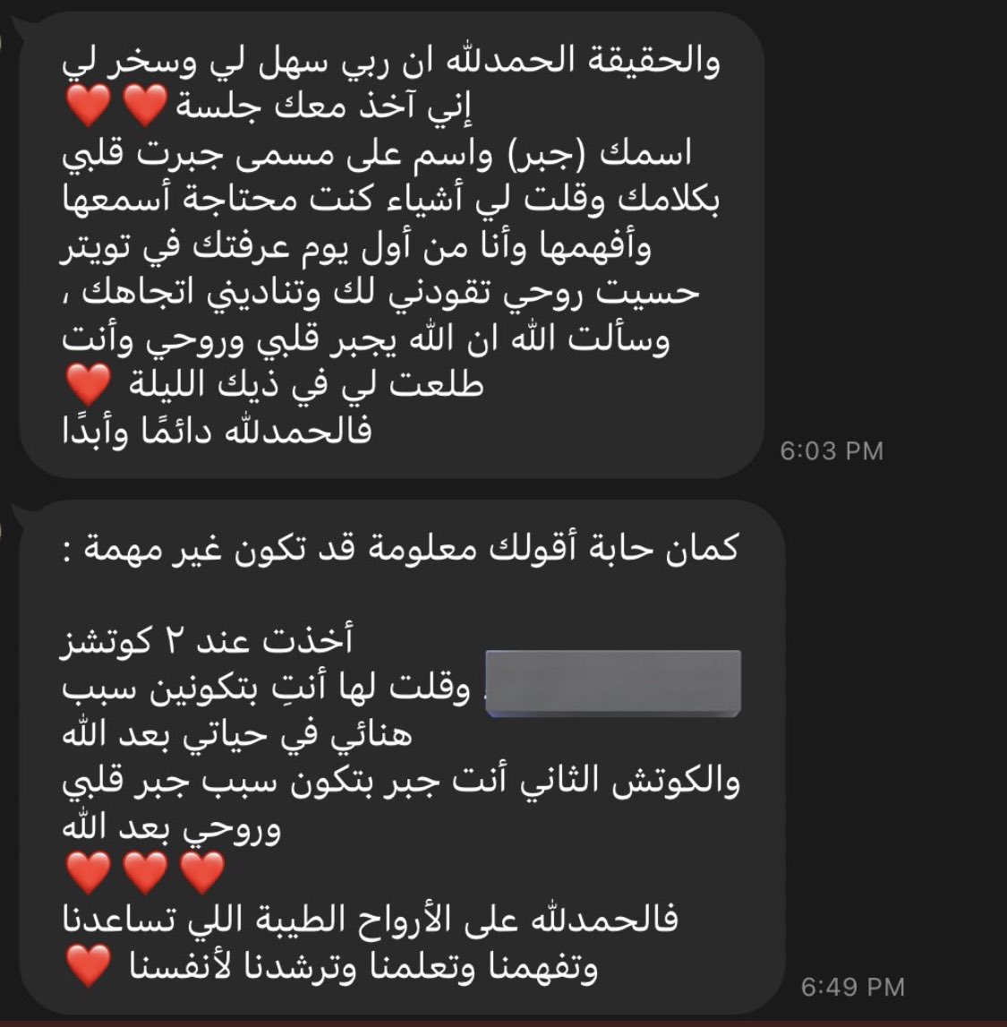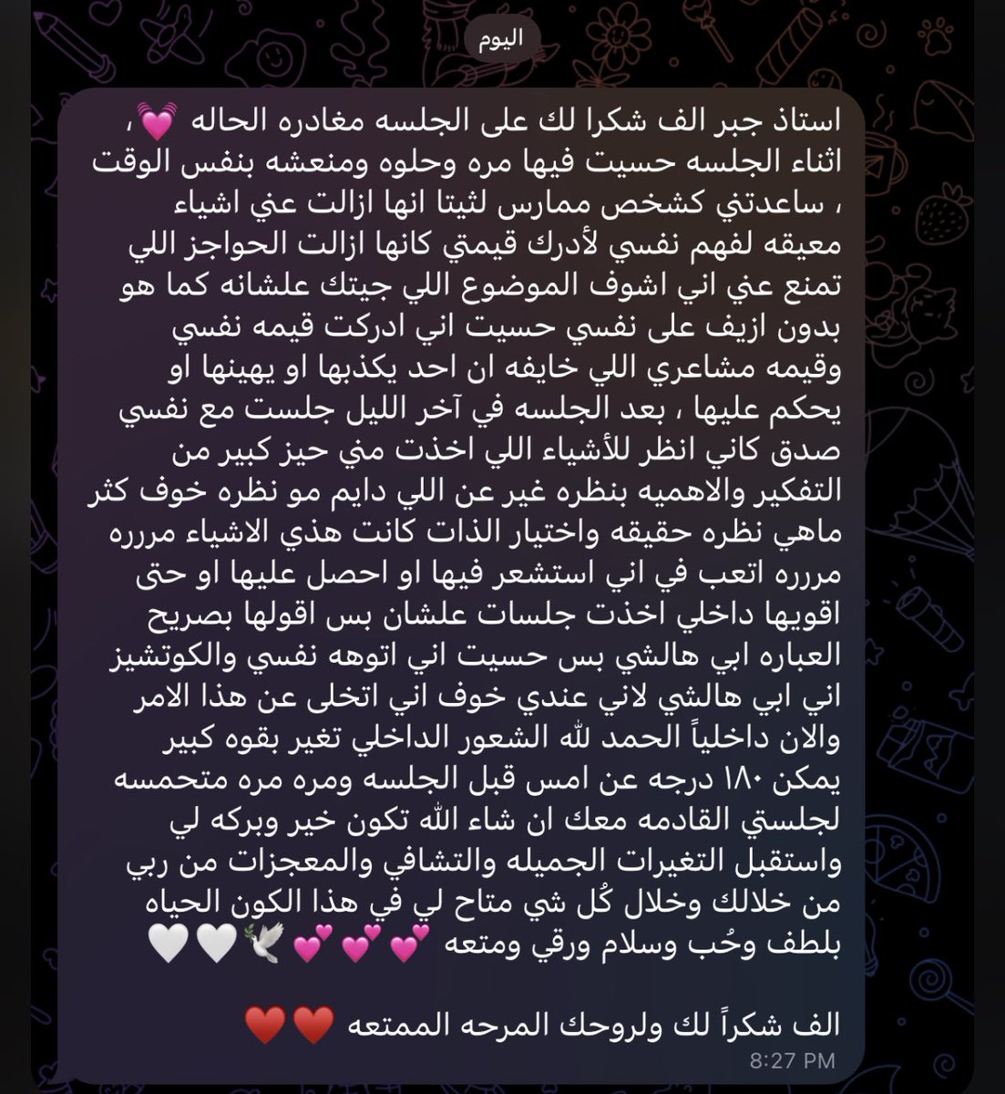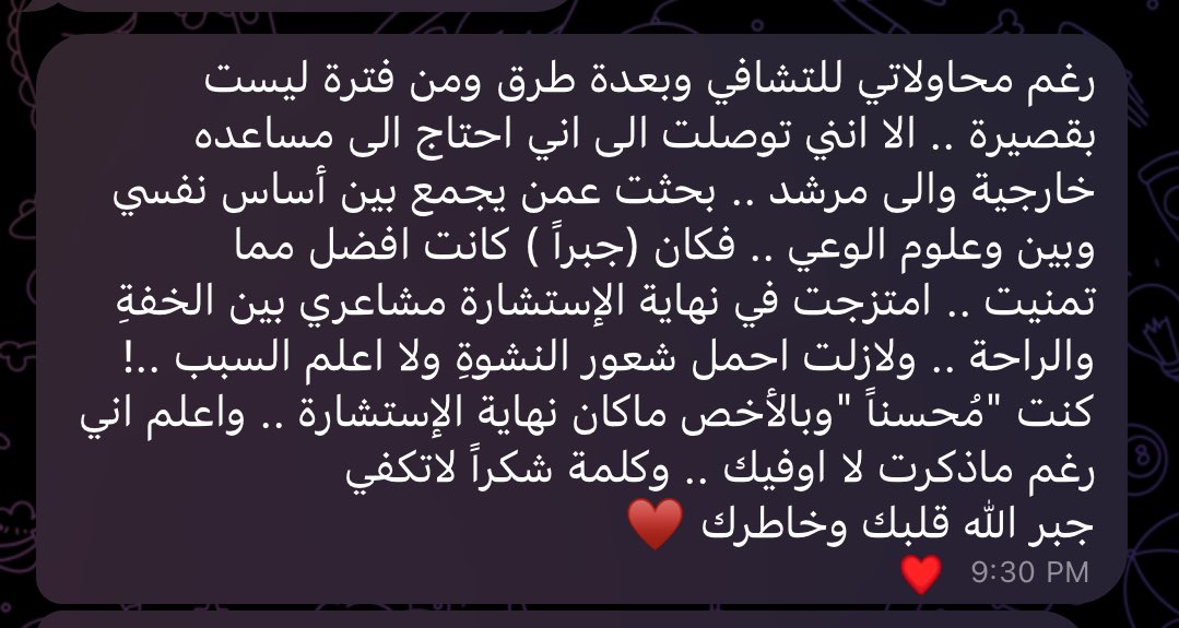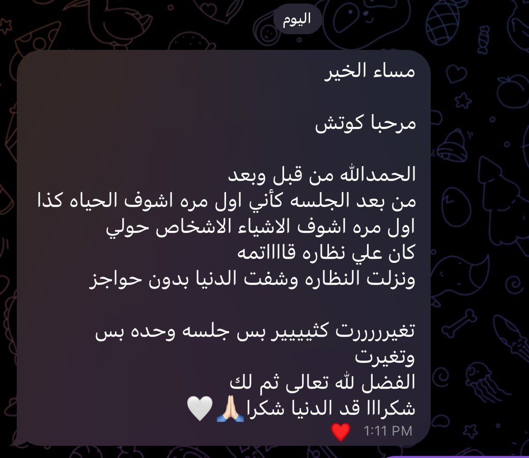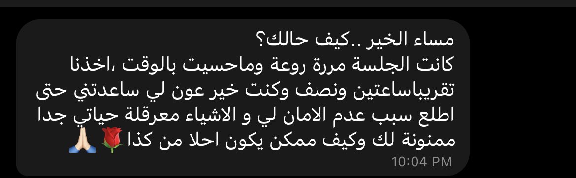 شكراً لله اولاً فوق كل شيء ، وحباً لإستقبالكم للجلسات واسهامكم لي ايضاً ❤️