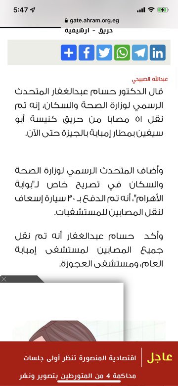 يبدو أن عدد الإصابات كبير في حريق #كنيسة_إمبابة بعد نقل ٥٥ حالة إلى المستشفيات. وجاري حصر الوفيات كما نقل موقع إعلام دوت كوم.