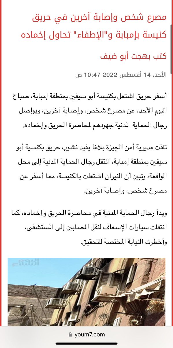 "تلقت مديرية أمن الجيزة بلاغا يفيد نشوب حريق بكنسية أبو سيفين بمنطقة إمبابة، انتقل رجال الحماية المدنية إلى محل الواقعة، وتبين أن النيران اشتعلت بالكنيسة، مما أسفر عن مصرع شخص، وإصابة آخرين." اليوم السابع