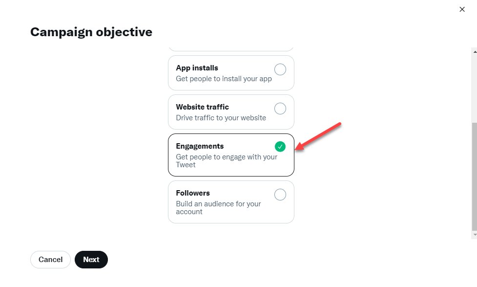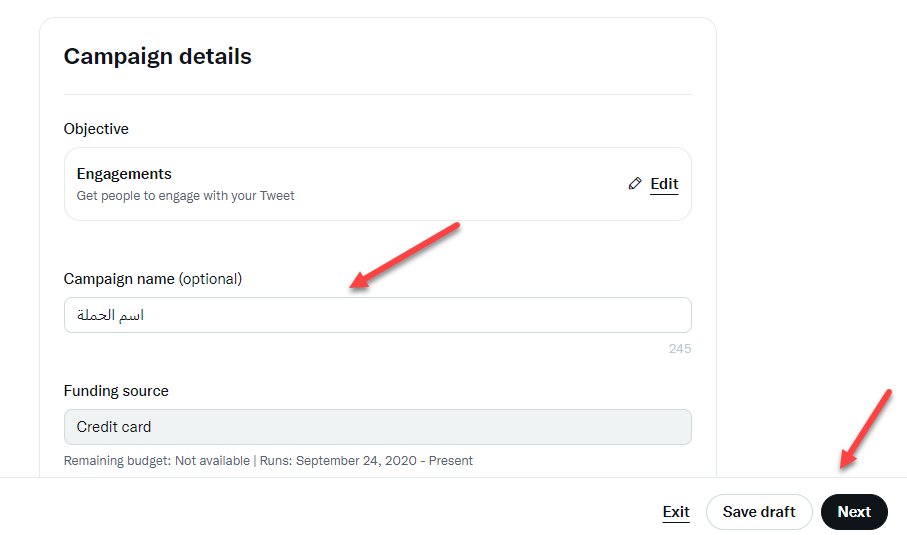 اذهب إلى ads.twitter.com , وستظهر لك نافذة منبثقة (كما بالصورة) بشكل تلقائي (إذا كانت إعدادات حسابك مفعّلة بشكل كامل)، إذا لم تظهر لك هذه النافذة تأكد من ضبط إعدادات حسابك مثل طريقة الدفع Payment Method وانشاء حساب إعلاني وغيرها.