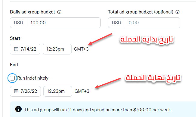 في حال عدم تحديد ميزانية إجمالية للحملة ستستمر حتى تاريخ نهاية الحملة الذي قمت بتحديده، أيضًا إذا لم تضع تاريخ نهاية للحملة ستستمر حتى يتم إيقافها يدويًا.