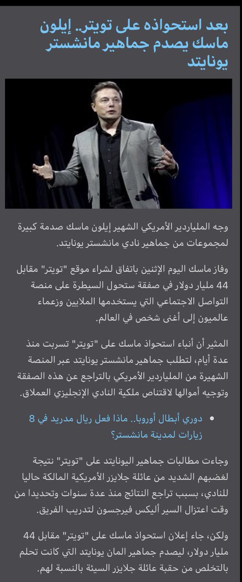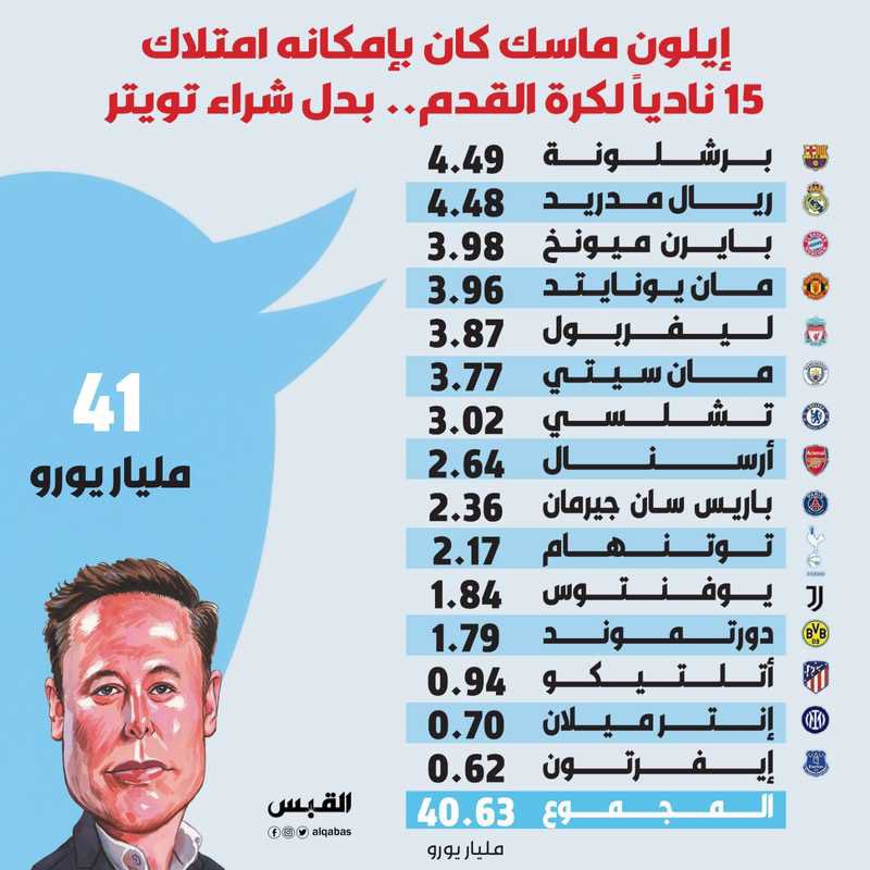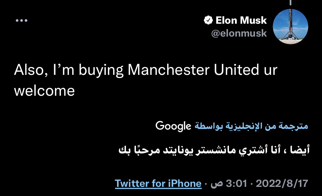 إيلون ماسك صاحب القرارات الغربية أحيانا يعلن عزمه لشراء نادي الإنجليزي مانشستر يونايتد والذي يقدر قيمته 2.08 مليار دولار، من الواضح أنه سوف يترك شراء منصة تويتر التي تقدر قيمتها عن 15نادياً معظمها قوي