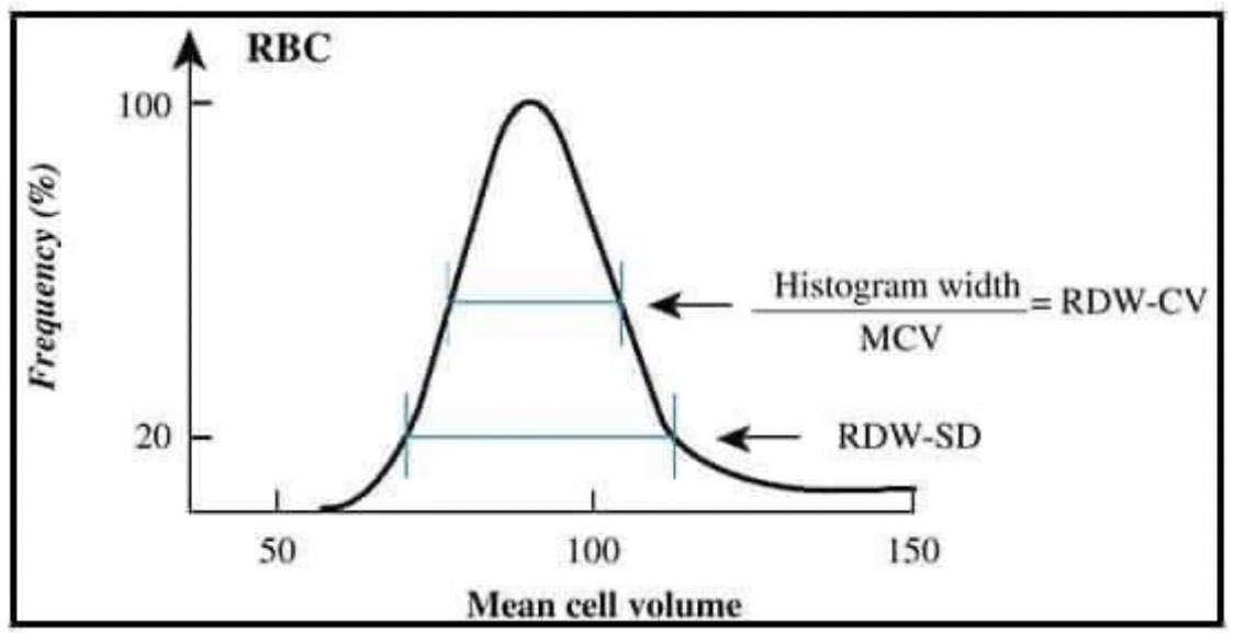 (RDW-SD) او (RDW- Standard deviation) و هذه قيمة بتتقاس مباشرة من على هيستوجرام كرات الدم الحمراء (عند 20% من كرات الدم) اي ان الجهاز بيشوف اصغر حجم تم قياسه ل 20% من كرات الدم الموجودة و بيشوف اكبر حجم تم قياسه ل 20% من