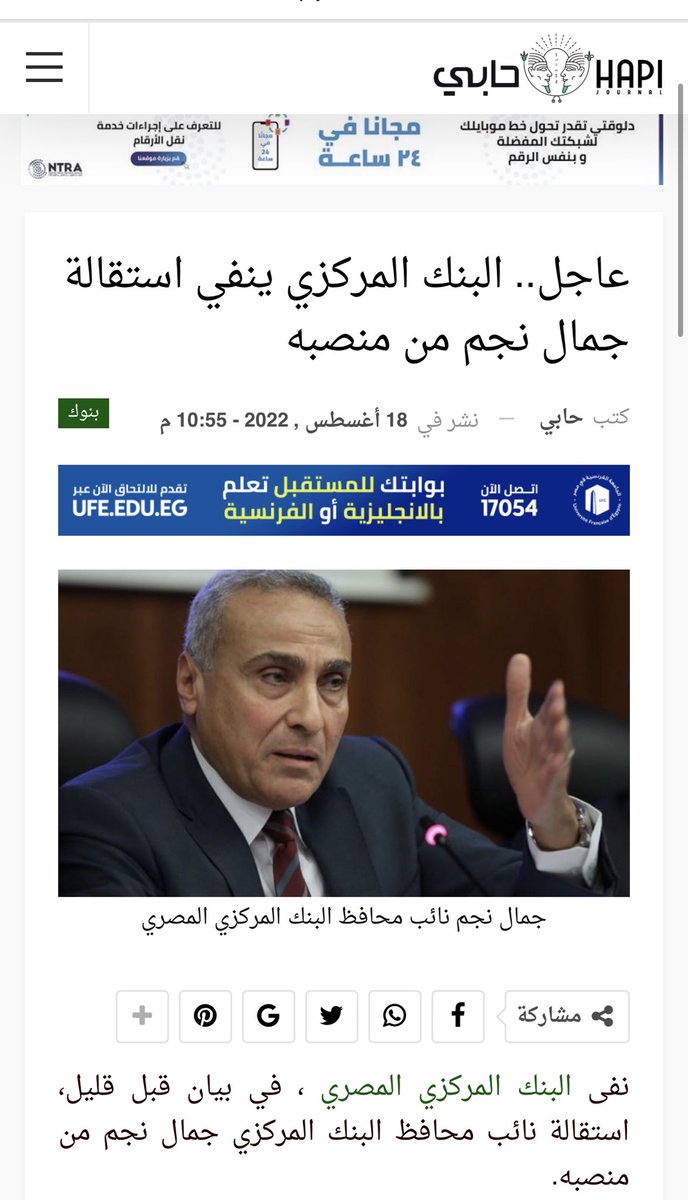 البنك المركزي ينفي ما تم تداوله مؤخرا في بعض المواقع الإلكترونية ووسائل التواصل الاجتماعي حول استقالة جمال نجم نائب المحافظ، مؤكدا استمراره في أداء مهام عمله على نحو طبيعي.