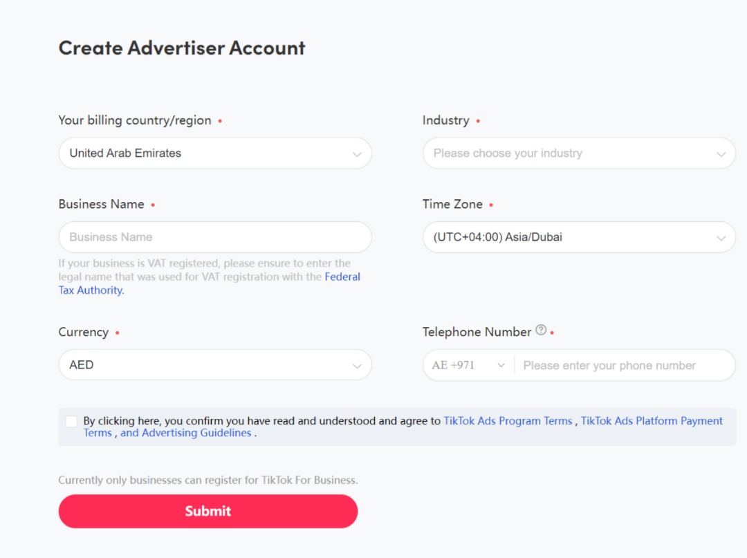 1- قم بانشاء حساب اعلاني على Tik tok for business وتقوم بفعل ذلك بتسجيل بريدك الالكتروني وكلمة المرور كما في الصورة: