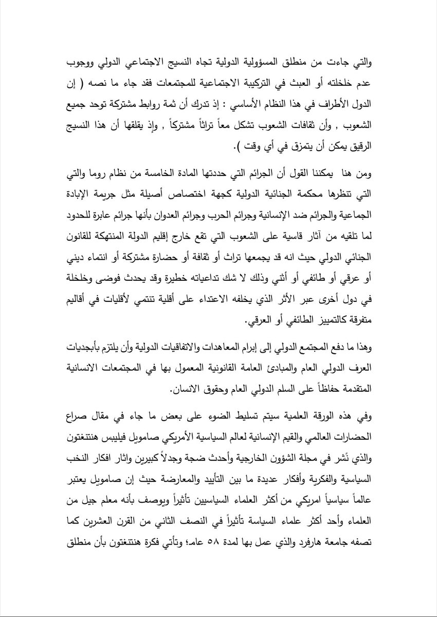 بعنوان:( أثر صراع الحضارات العالمي والقيّم الإنسانية )