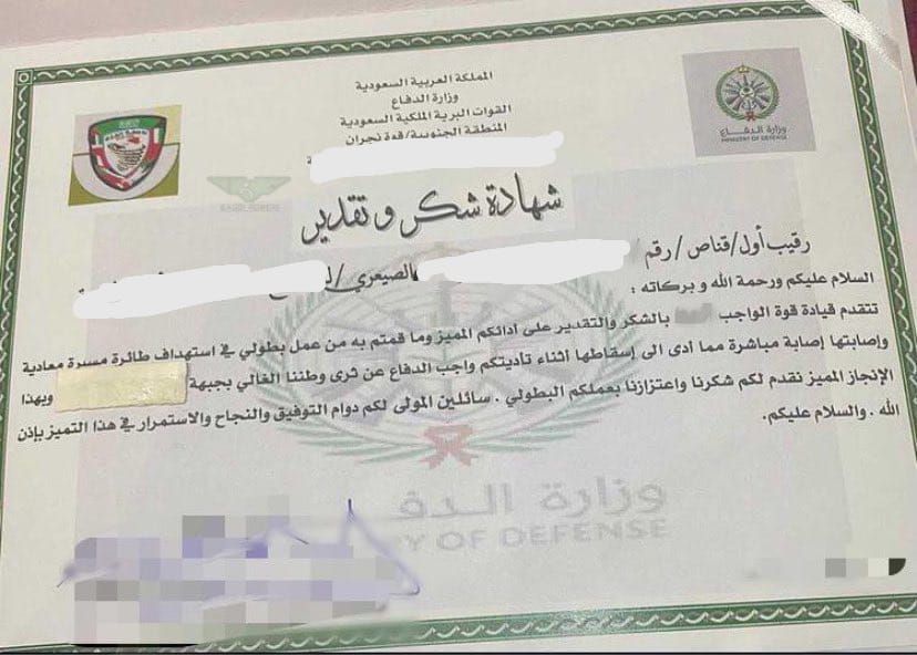 - نشر حساب @SAUDI_POWER0 في وقت سابق شهادة بطولة وشكر وتقدير للبطل الرقيب اول/قناص الصعيري .. البطل اعترض طائرة مسيرة انتحارية بواسطة بندقية قنص.