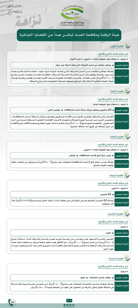 صرّح مصدر مسؤول في هيئة الرقابة ومكافحة الفساد بأن الهيئة باشرت عدداً من القضايا الجنائية خلال الفترة الماضية، وجارٍ استكمال الإجراءات النظامية بحقهم. وكانت أبرز القضايا على النحو الآتي: