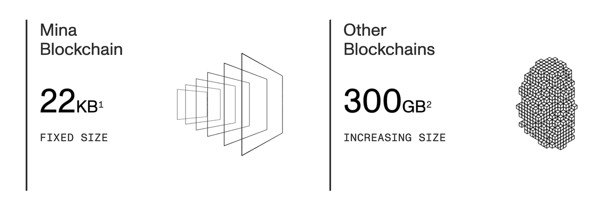 أولًا؛ يجب أن نعلم أن مشروع #MINA يوفر تقنية فريدة وهي بلوكتشين بحجم 22KB لا يتغير مع زيادة عدد المعاملات التي يتم تسجيلها على البلوكتشين.. لأن بلوكتشين مينا عبارة عن صورة أو إثبات للمعاملات.. فلا يتم تسجيل المعاملات نفسها ولكن يتم تسجيل إثبات لحدوثها.