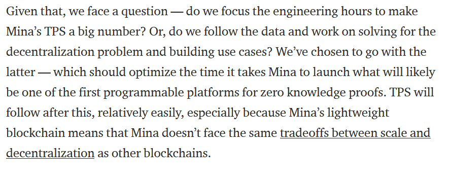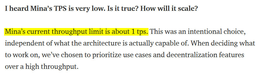 لكن هل يمكن لهذا المفهوم -الذي لم يتبناه أحد حتى الآن- أن يغني عن حقيقة أن بلوكتشين MINA -وإن تمتعت بالخفة المطلقة من حيث الحجم- لا يمكنها استيعاب زيادة عدد المستخدمين الذين بدورهم سيقومون بتنفيذ أعداد هائلة من المعاملات في الثانية الواحدة؟