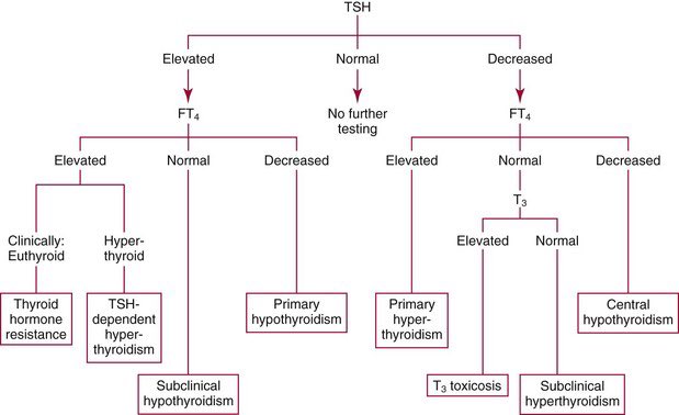 في الأغلب، يكون اختبار الدم الأولي لاضطرابات الغدة هو TSH وفي حالة ارتفاع نتيجته أو انخفاضها تتبع تلقائيا بقية الاختبارات T4 ثم T3