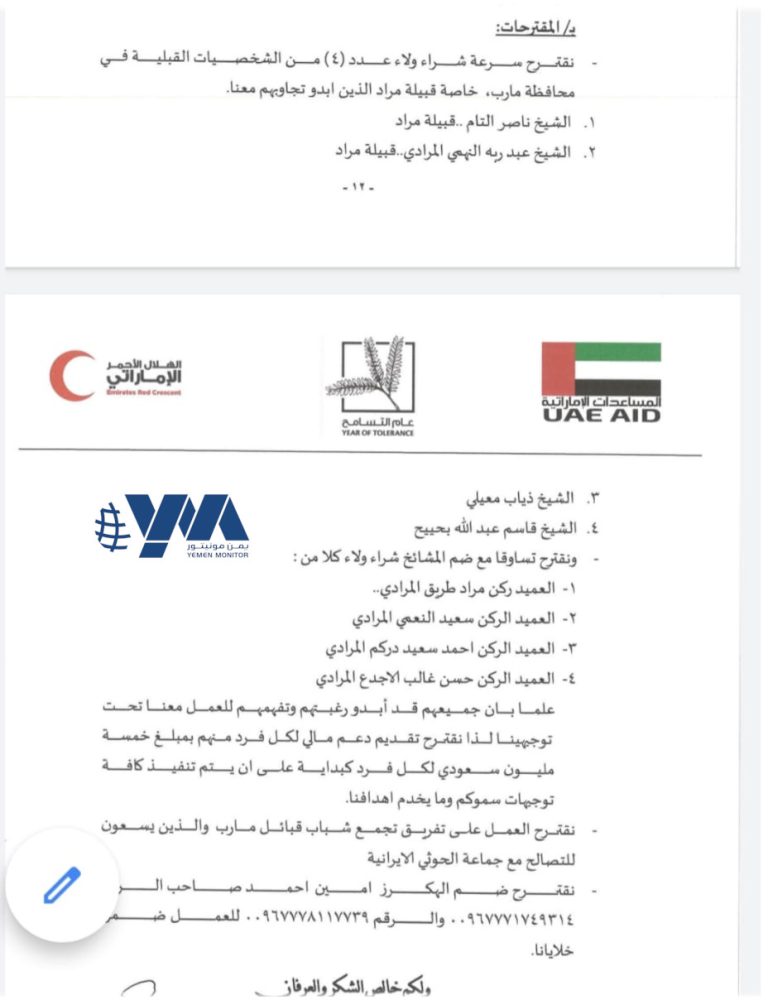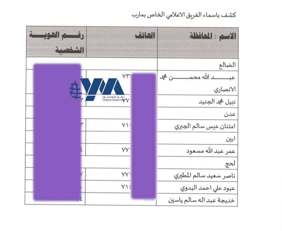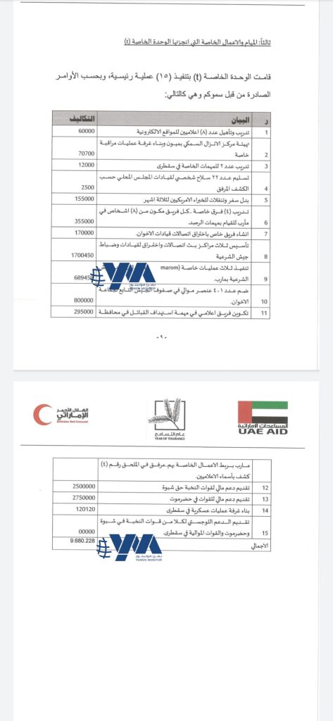 الوثيقة: الوحدة الخاصة قامت بتكوين فريق اعلامي في مهمة استهداف القبائل في محافظة #مأرب يربط الأعمال الخاصة بهم مرفق في الملحق رقم 4 كشف بأسماء الإعلاميين. يشير الكشف إلى أسماء سبعة وصفوا بالإعلاميين من عدة محافظات ليس بينهم من مأرب.