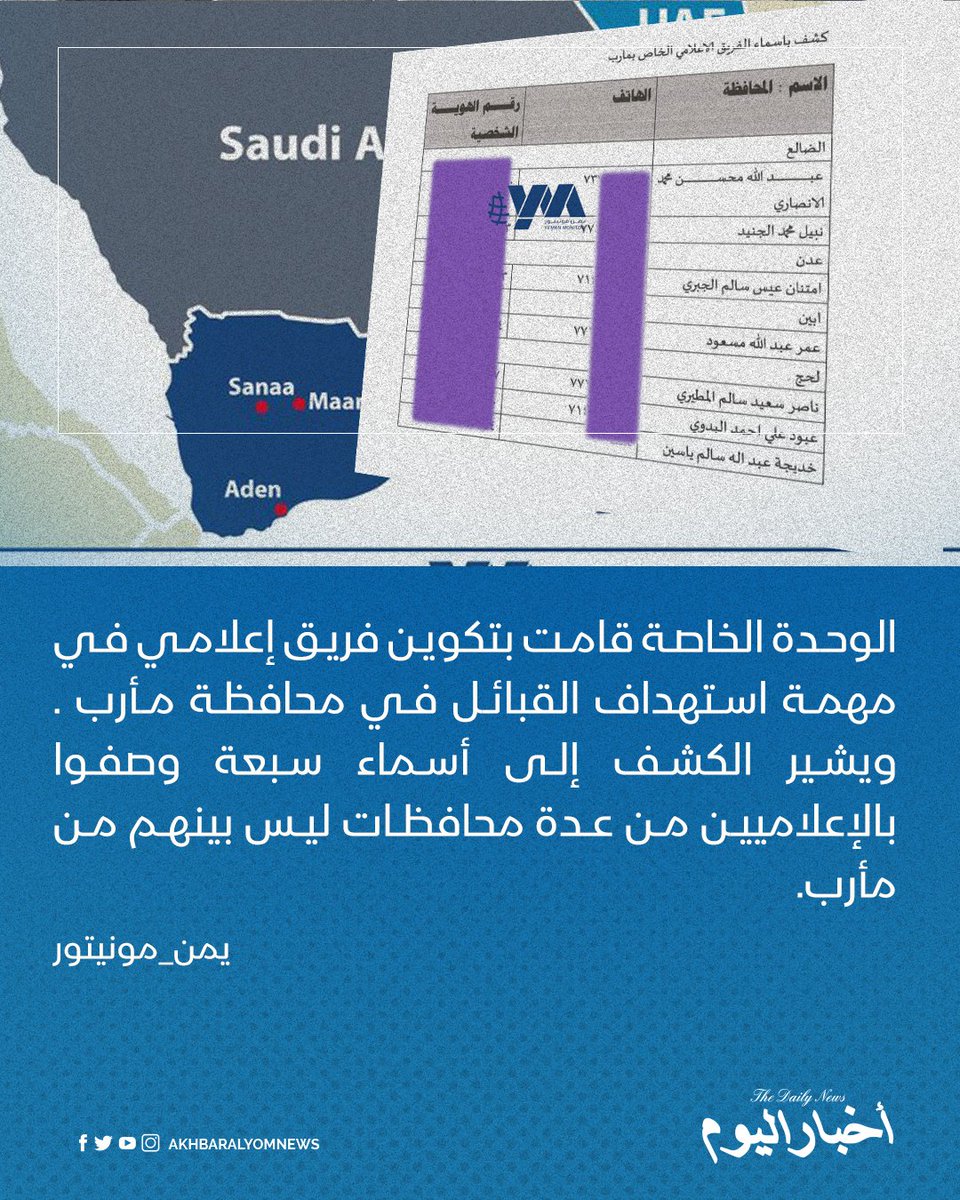 ويشير الكشف إلى أسماء سبعة وصفوا بالإعلاميين من عدة محافظات ليس بينهم من مأرب.