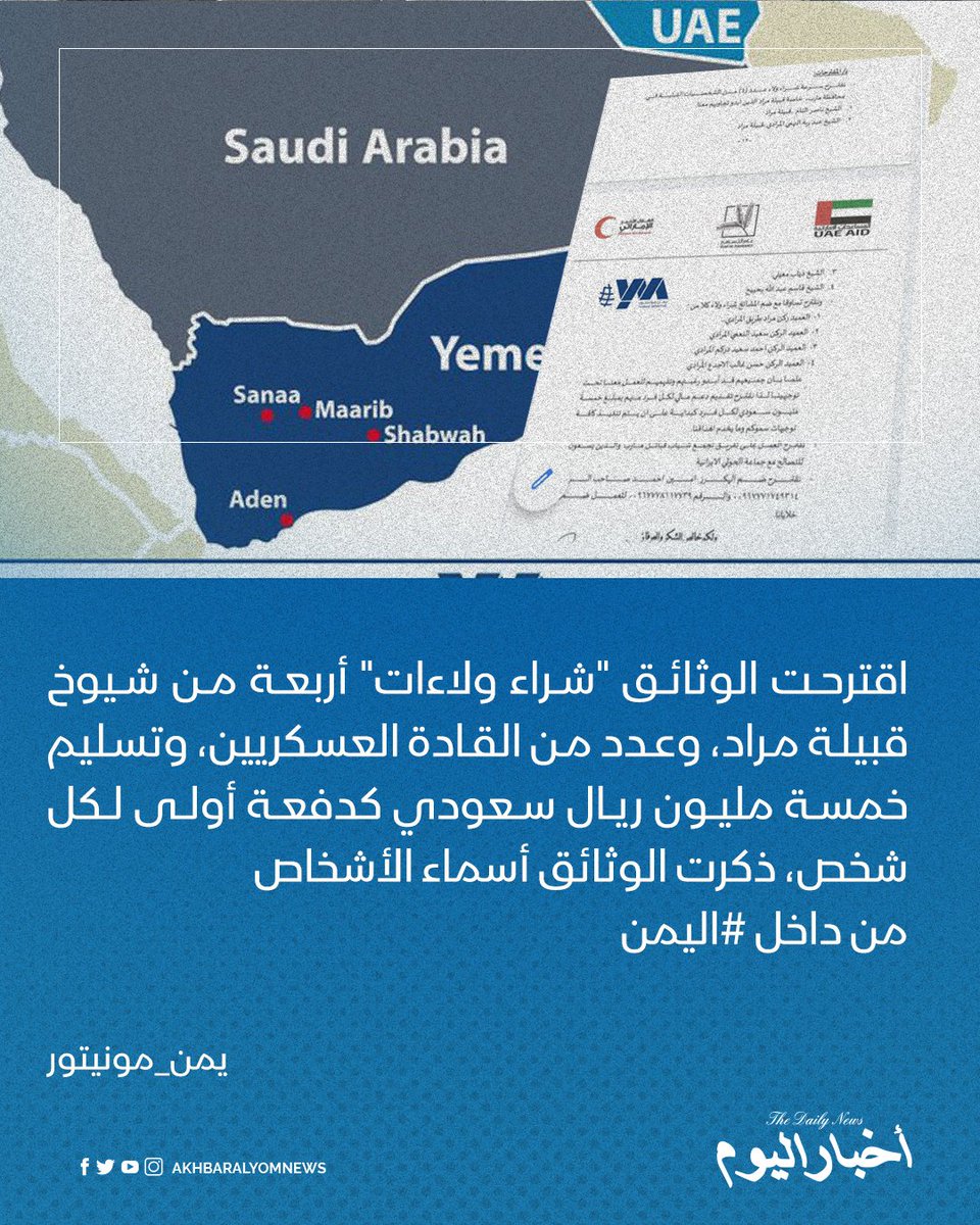 🔹️اقترحت الوثائق "شراء ولاءات" أربعة من شيوخ قبيلة مراد، وعدد من القادة العسكريين، وتسليم خمسة مليون ريال سعودي كدفعة أولى لكل شخص، ذكرت الوثائق أسماء الأشخاص