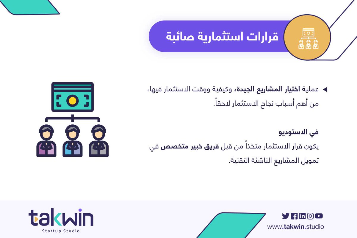 عملية اختيار المشاريع الجيدة، وكيفية ووقت الاستثمار فيها، هي من أهم أسباب نجاح الاستثمار لاحقاً، وفي الاستوديو يكون القرار متخذاً من قبل فريق خبير متخصص في تمويل المشاريع الناشئة التقنية.