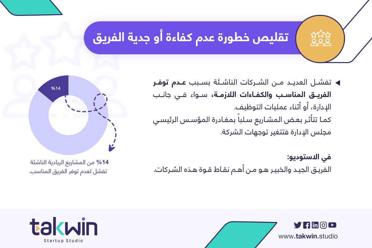 تفشل 14% من الشركات الناشئة لعدم توفر الفريق المناسب، سواء في جانب الإدارة، أو في الكفاءات اللازمة أثناء عملية التوظيف، وذلك بخلاف الشركات داخلل استوديو الشركات الناشئة، حيث يعتبر عامل الفريق الجيد والخبرة من أهم نقاط قوة هذه المشاريع.