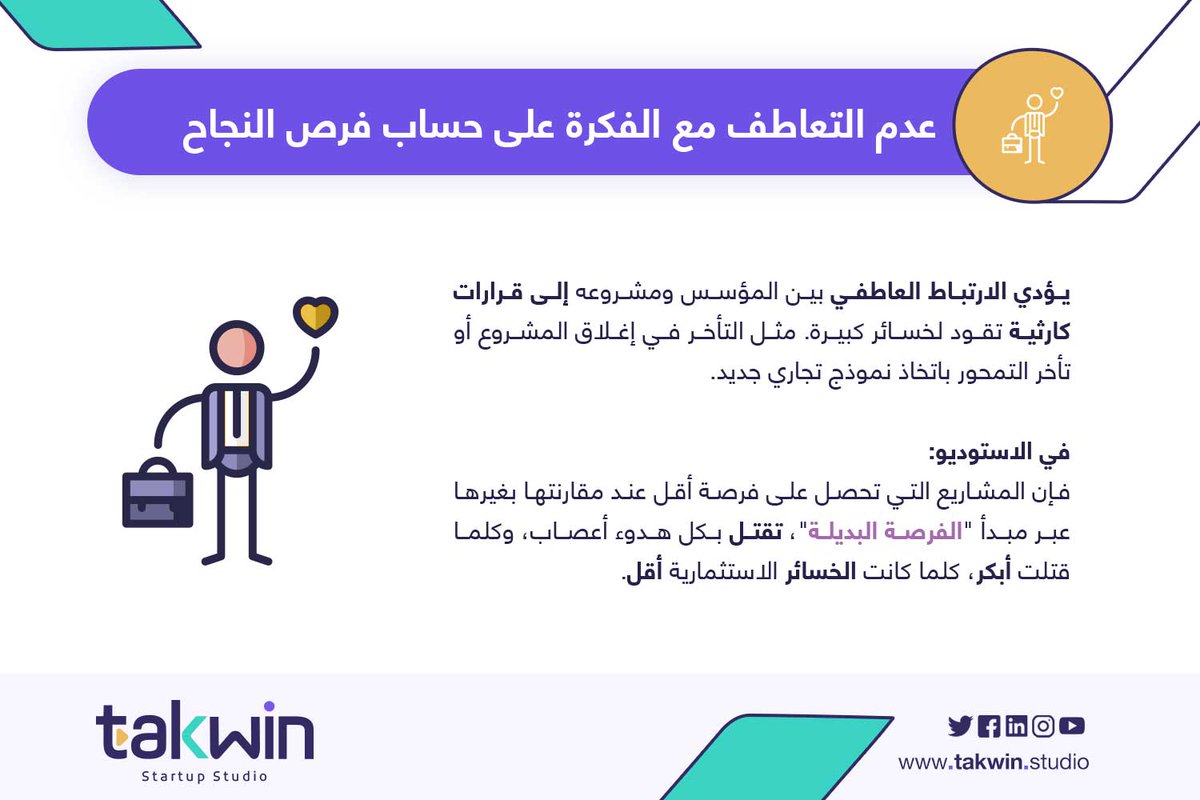 كثيراً ما يؤدي الارتباط العاطفي بين المؤسس ومشروعه إلى قرارات كارثية قد تؤدي إلى خسائر كبيرة.