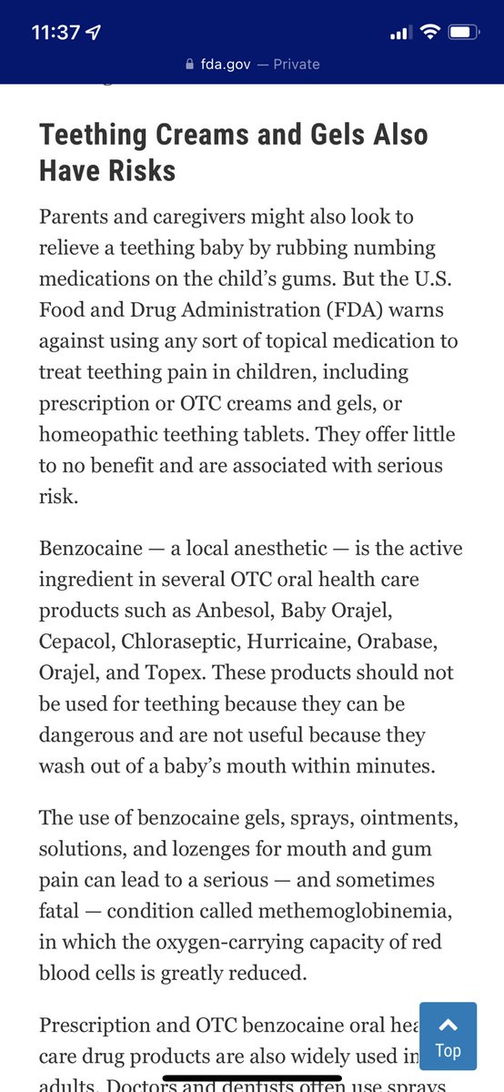 في #الصيدلية فيه جل عبارة عن مخدر موضعي ومطهر. قد تلجأ له الأم ولكن لا يفضل استخدامه لأن ضرره أكبر من نفعه