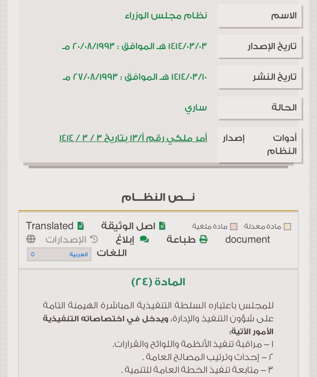 5/ بمعنى أن مجلس الوزراء سيكون له كذلك "الحق بالترتيب والتعديل في المرافق العامة والمصالح العامة" حتى لو لم يتم النص على ذلك بموجب النظام طالما أنه مُنح الصلاحية الأعلى ألا وهي "صلاحية الإحداث"، وطالما أنه لم يكن هناك نص قانوني صريح يمنع ذلك، فالعبرة حينها بالقواعد العامة.