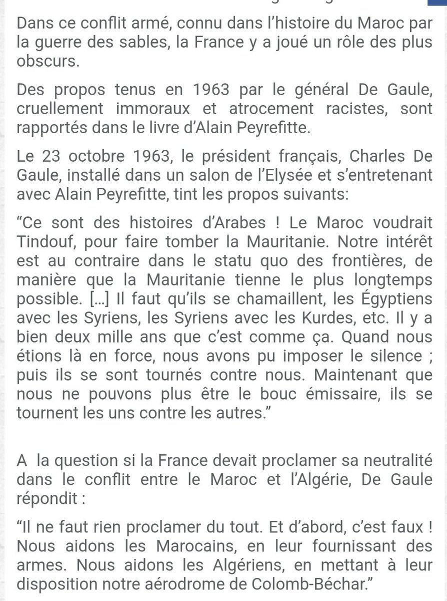 هاته أمور تهم العرب #المغرب يريد تندوف لاسقاط موريتانيا مصلحتنا ان تبقى الحدود التي تركنا ولا تتغير.. وان تصمد موريتانيا أطول وقت ممكن يجب ان يبقى النزاع ويبقى كدالك خصام بين مصر وسوريا والاكراد.. قرون وهم يتخاصمون لما كنا هناك استطعنا إسكاتهم بالقوة ولما تاروا ضدنا رجعوا لعادتهم