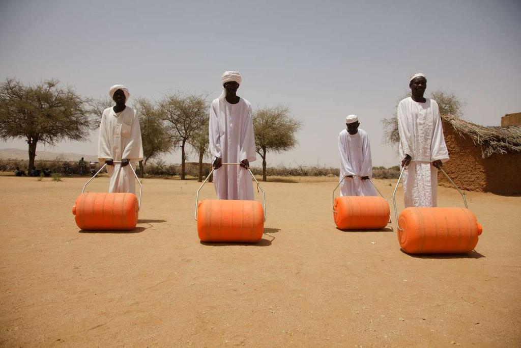 يظهر في الصورة ابتكار اسمه "هيبو رولر" يسمح للعائلات بجمع ونقل خمسة أضعاف كمية المياه بصورة سهلة وبسيطة.