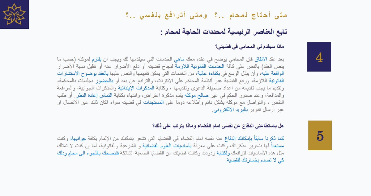وبلا شك أن من المفيد في الترافع بعد امتلاك المعرفة والمهارة القانونية والرأي القانوني السليم أن نستفيد كذلك من نصائح الأطباء النفسيين وخبراء الصحة النفسية لمن يعاني من حالة مفرطة من عدم التوازن النفسي .. ومن الضروري لهم تعلم مهارات الصحة النفسية للتعامل مع المواقف الصعبة ..