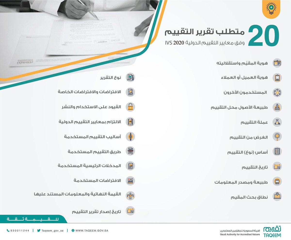 وهذا انفوجرافيك يلخص أهم المتطلبات الواجب توافرها في "تقرير التقييم العقاري" والمعتمدة من الهيئة السعودية للمقيمين المعتمدين وفقاً لمعايير الدولية. @taqeem_gov_sa