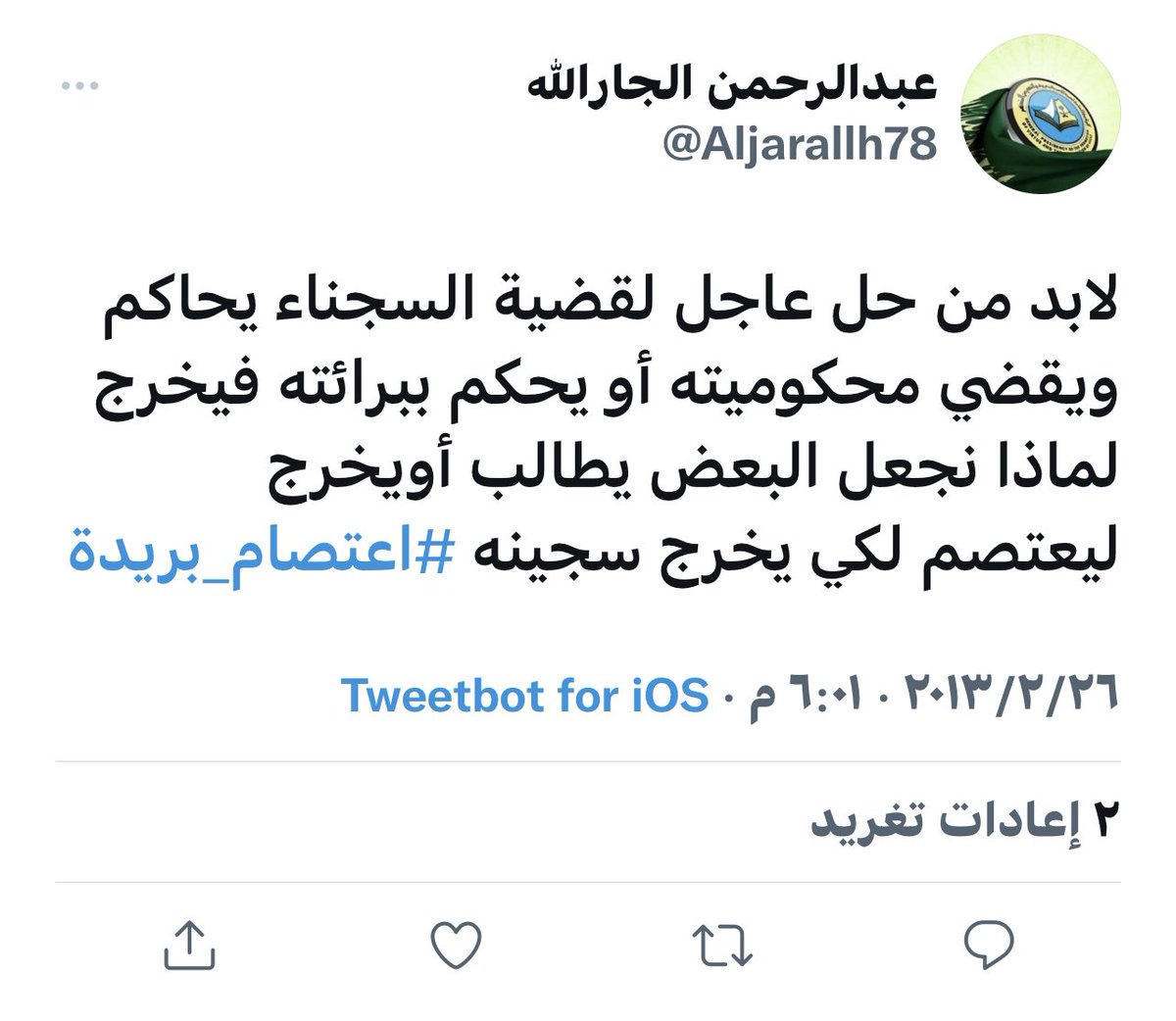 وجدت في حساب عبدالرحمن الجارالله العضيب معلم المرحلة الثانوية وإمام وخطيب جامع بن عقيل بالزلفي تغريدة فيها دعم ودفاع عن اعتصام حروريات بريدة وتبرير فعلتهن