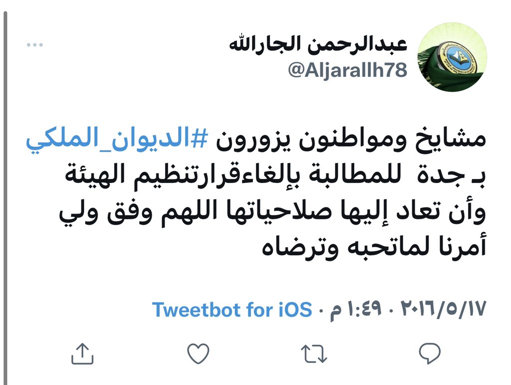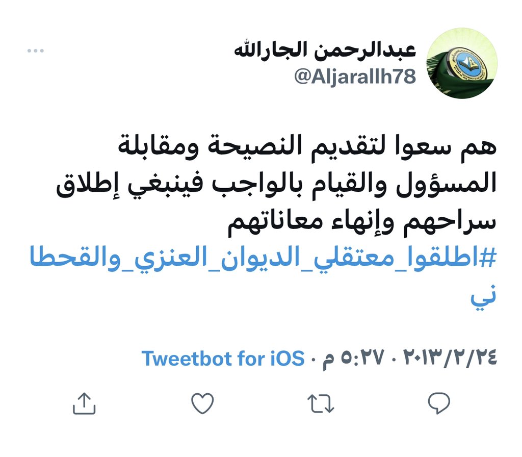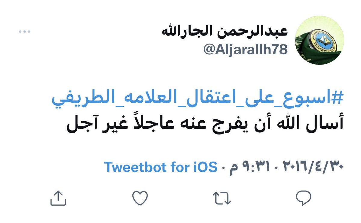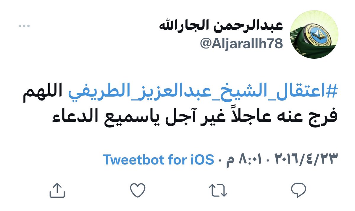 وجدت في حساب عبدالرحمن الجارالله العضيب معلم المرحلة الثانوية وإمام وخطيب جامع بن عقيل بالزلفي عدد من التغريدات التي فيها دعم ومناصرة للموقوفين الامنيين ومطالبات لاطلاق سراحهم